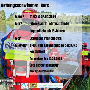 In Zusammenarbeit mit der Wasserwacht Pfaffenhofen bieten wir dieses Jahr einen Rettungsschwimmer-Kurs (bronze und silber) an. Ziel ist es, Ehrenamtliche in der Kinder- und Jugendarbeit optimal auf Freizeitmaßnahmen am und im Wasser vorzubereiten. Sicherheit hat oberste Priorität – mit dem Rettungsschwimmer-Abzeichen bist du in der Lage, im Ernstfall schnell und richtig zu handeln und Leben zu retten. Im Kurs lernst du die Grundlagen der Wasserrettung, verschiedene Rettungstechniken und den sicheren Transport im Wasser. Außerdem werden Erste-Hilfe-Maßnahmen bei Wasserunfällen sowie Selbstrettung und Gefahreneinschätzung vermittelt. Praktische Übungen im Schwimmbad runden die Ausbildung ab. Der Kurs bietet einen großen Mehrwert für die Jugendarbeit: Du erhöhst die Sicherheit bei Ferienfreizeiten, Zeltlagern und Ausflügen, erfüllst wichtige Vorgaben für Aufsichtspersonen und stärkst deine Qualifikation als Jugendleiter. Das schafft Vertrauen bei Eltern und Teilnehmerinnen und sorgt für entspannte und sichere Aktionen am Wasser.